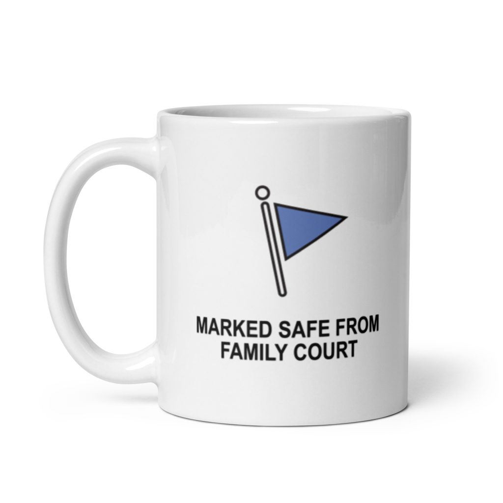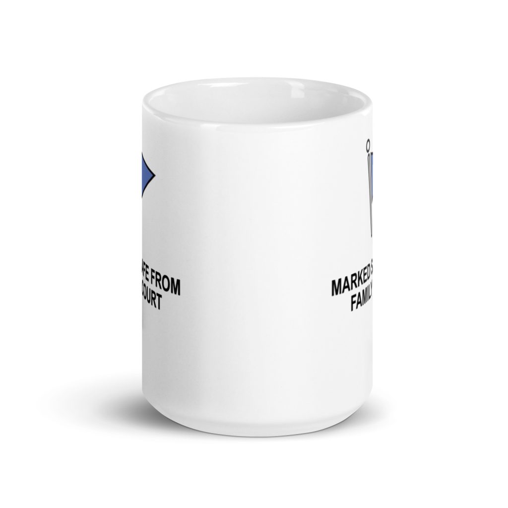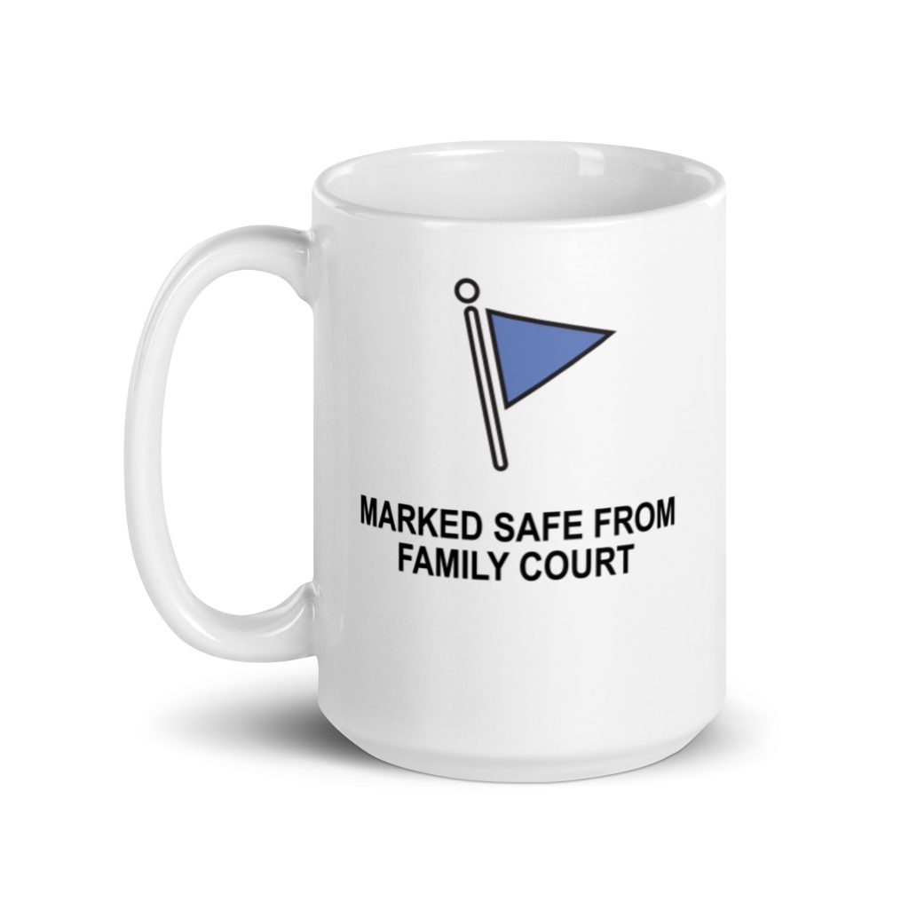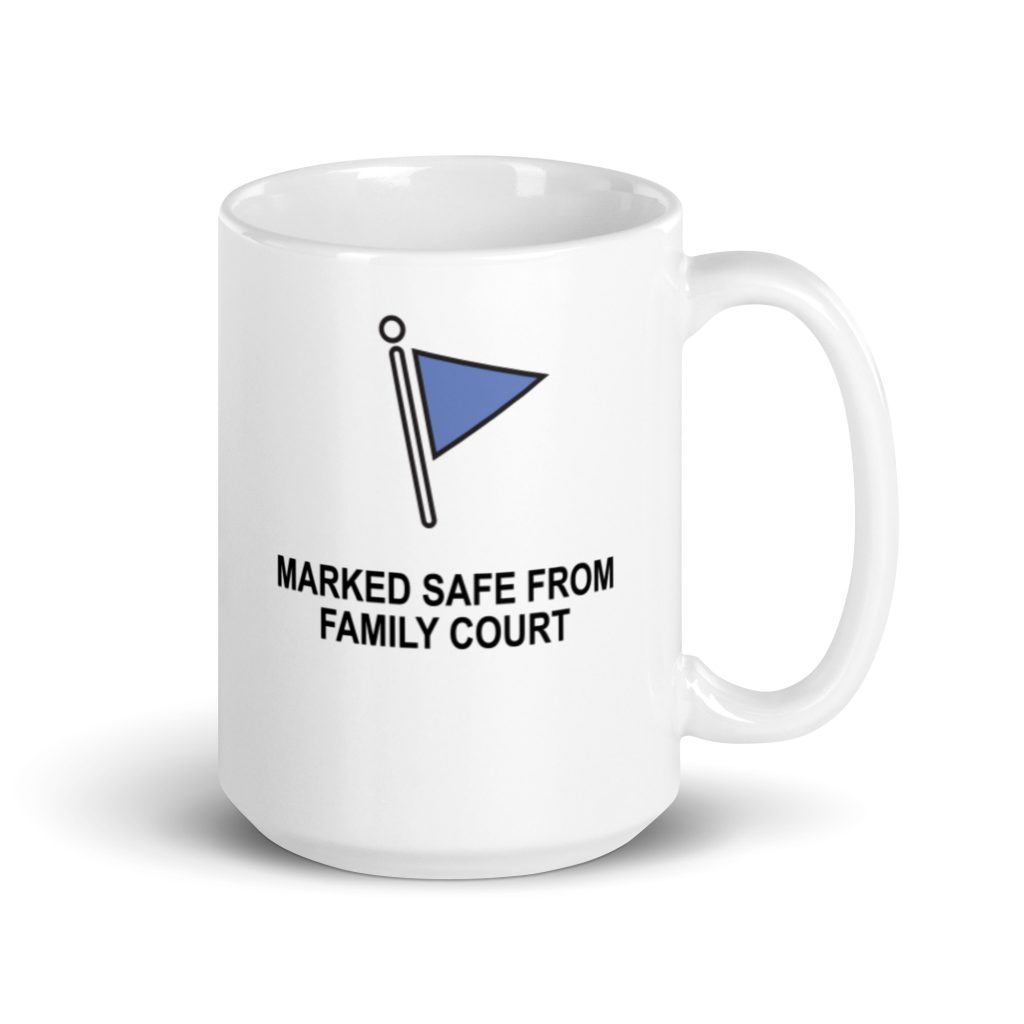 Marked Safe From Family Court ChildFree White glossy mug